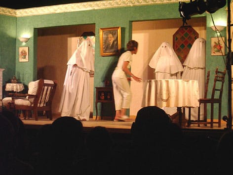 Pour parvenir à ses fins, elle imagine de lui faire signer subrepticement un document lui donnant l’usu-fruit de la propriété. Mais toutes ses tentatives pour obtenir cette signature tant convoitée vont échouer les unes après les autres. Elle imagine alors une ultime solution : avec l’aide de trois amis déguisés en fantômes, elle va essayer de faire croire à sa tante et à son oncle que le manoir est hanté. Pourtant, là encore, elle va se heurter à des difficultés imprévues. Un fou échappé de l’asile, un couple épique de cambrioleurs, un oncle se transformant en pépé flingueur, aidé par la bonne et l’infirmière, tout va contribuer pour Clotilde à un échec cuisant. Et c’est aussi sans compter sur l’arrivée inattendue du « vrai » fantôme du manoir ! Quant à la tante, sourde « comme trente-six mille pots », elle traversera cette aventure dans une complète insouciance.