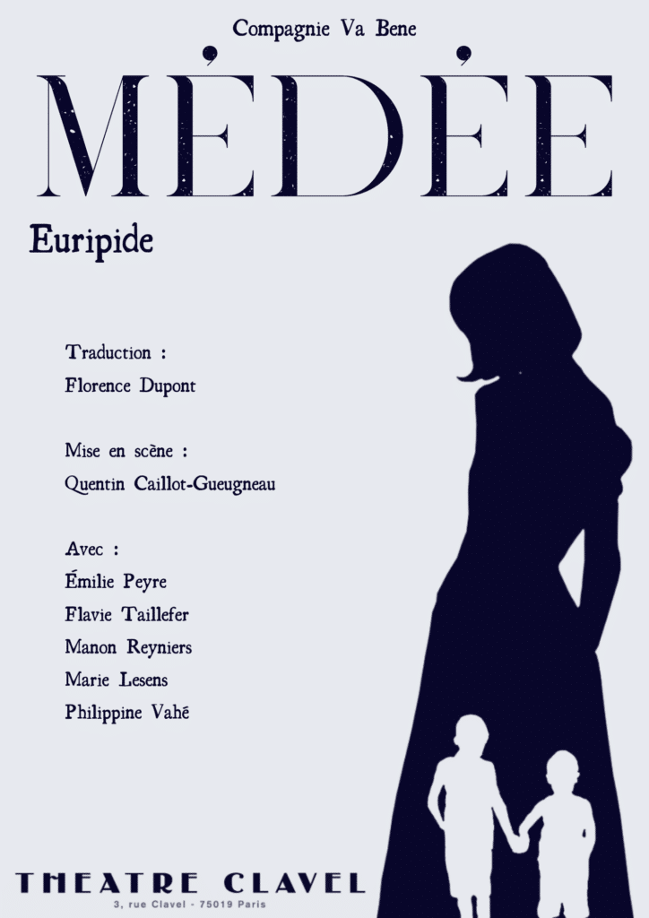 Mise en scène : Quentin Caillot-GueugneauAvec : Émilie Peyre (Médée), Flavie Taillefer (Jason), Manon Reyniers (Le Chœur ), Philippine Vahé (Créon - la gouvernante - une créature) & Marie Lesens (La Nourrice - Égée - le messager - une créature)